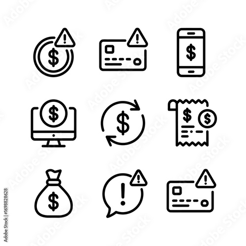 Financial Alert Icons Warning Symbols on Documents Money and Technology.