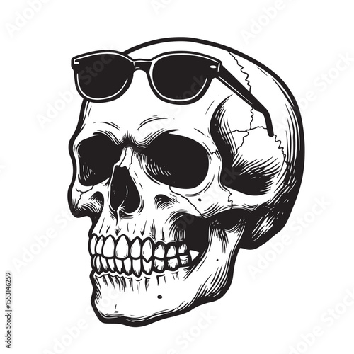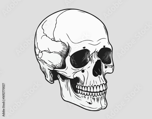 Human Skull Side View Detailed Engraved Black and White Outline Line Art Drawing