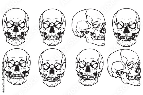 Ten skull illustrations in varying front and side views, depicted in black and white with detailed line work.