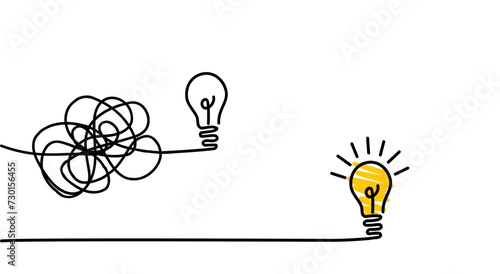 One continuous line drawing of tangled and scribble wires with light bulbs. Concept of complex problem solving process and Clarifying idea in simple linear style. Editable stroke. Vector illustration
