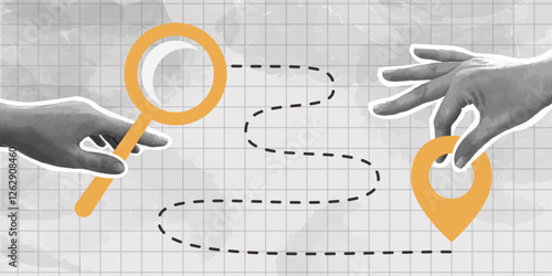 Trendy collage with halftone hands holding position element and search bar. GPS navigation. Pin location. Travel way and find trip. Transport logistic.  Package tracking. Contemporary art vector