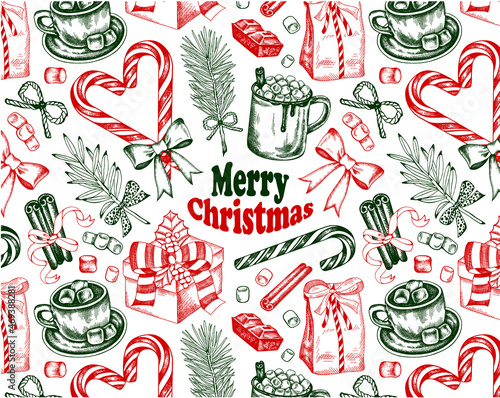 Sketch drawing colorful pattern of hot cocoa with marshmallows and cinnamon isolated on white background. Line art hand drawn hot chocolate wallpaper. Christmas menu, winter drink. Vector illustration