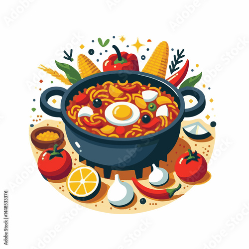 Colorful Paella Illustration with Seafood Chicken and Vegetables in Pan.