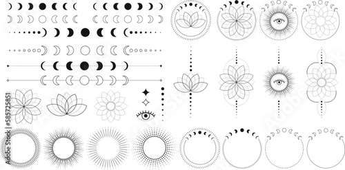 Moon phases. Set of mystical drawings with sacred lunar activity. Magical astrological symbols with mysterious geometry, crescent and moon stages. Cartoon flat vector illustration collection
