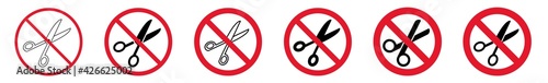 Prohibition Sign Scissors Cut Forbidden Icon Set | Scissors Cutting Prohibition Signs Prohibited Vector Illustration Logo | Scissors Sharp Pointed Prohibition Sign Isolated Collection