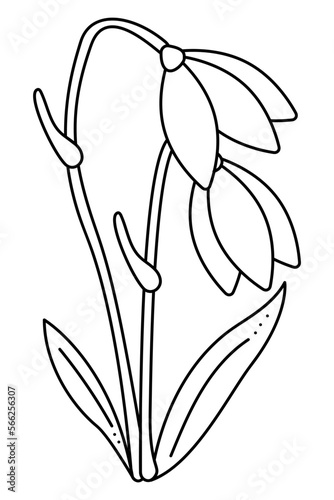 illustration of white with black drawing contour sketch of snowdrop. Graphic design isolated object for spring. Blossoming flowers.