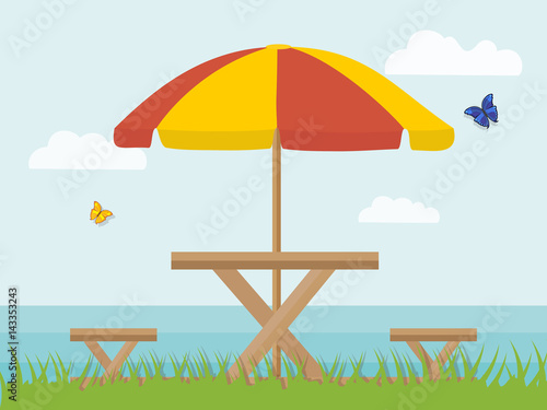 People on picnic outdoor with food and summer leisure, family on grass near trees and river with boat caroon vector illustration. Father, mother and daughter , kids on beach with picnic basket.