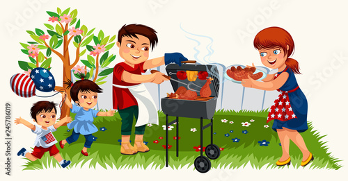 Happy family at a picnic is preparing a barbecue grill outdoors. Family picnic. Bbq party. Food and barbeque summer and grill