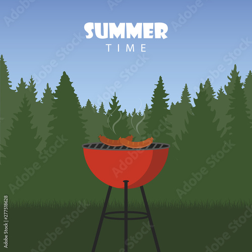green grass barbeque grill at park or forest trees and bushes flowers scenery background , nature lawn ecology peace vector illustration of forest nature happy funny  picnic cartoon style landscape