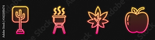 Set line Leaf or leaves, Tree, Barbecue grill and Apple. Glowing neon icon. Vector.