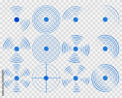 Signal radio waves icon wireless tech radar vector symbols graphic set, antenna detection sonar transmission rays, beacon acoustic sound voice locator station, transmitter frequency element image