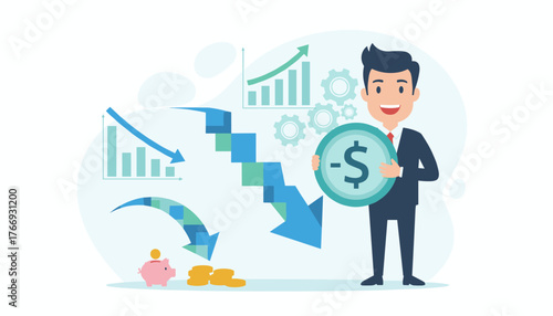 Man holding a large coin with a negative dollar sign, representing cost reduction and financial loss, surrounded by downward trending graphs and piggy bank, symbolizing budget challenges and economic