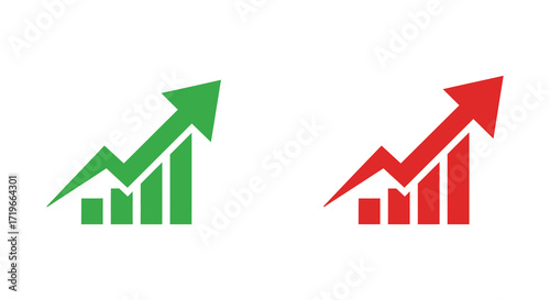 Green and red upward trending business growth charts showing profit increase and decrease isolated on white background