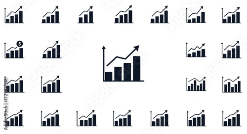 Collection of simple bar and line graph icons with upward trending arrows indicating growth and progress