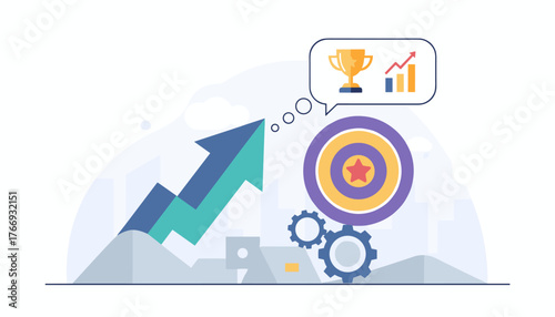 Modern flat illustration of business objective and target goal achievement, with upward trending graph, trophy, and gears symbolizing progress and success in a stylized cityscape background