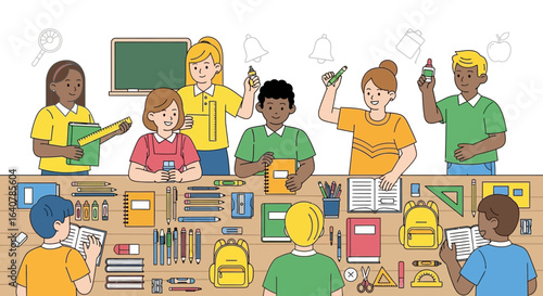 Cheerful illustration of three children sitting on the floor, surrounded by colorful stationery and playful decorations, evoking creativity, friendship, and a fun learning environment
