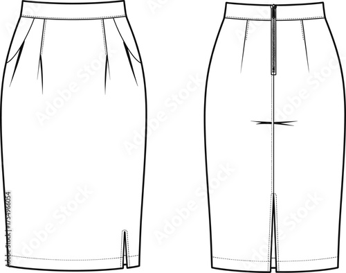 Pencil skirt technical sketch, fashion flat drawing, front and back view, garment design, apparel template, sewing pattern, clothing illustration