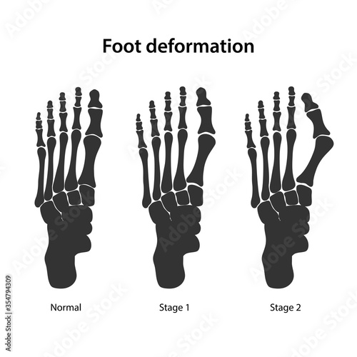 Valgus deformity of the big toe. Healthy foot and stages of development of the disease. From above view. Black vector illustration in flat style on white background