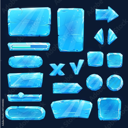 Game asset blue ice icons, sliders, arrows and keys, vector user panel interface plates. Game UI and GUI buttons, mobile gaming cartoon menu with levels of snow or glass tone blocks, navigation arrows