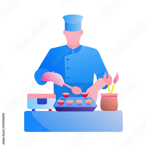 *Chef cooking sushi, simple linear interface icon in pink and blue on white background*