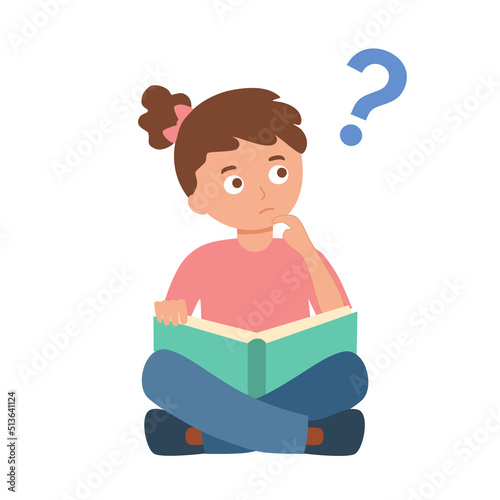 Thoughtful elementary school student puzzling over a difficult lesson in her book, sitting at a desk with question marks illustrating confusion, curiosity, and the learning process vector.