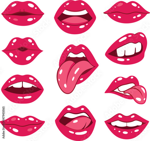 Red lips vector design with sexy woman’s lips showing different emotions, such as kiss, smile, biting, licking, half-open mouth, and playful tongue.