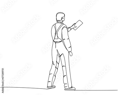 Puttying walls, leveling walls, worker in uniform, spatula, Steel Trowel, painter-plasterer one line art. Continuous line drawing of repair, professional, hand, people, concept, support, maintenance.