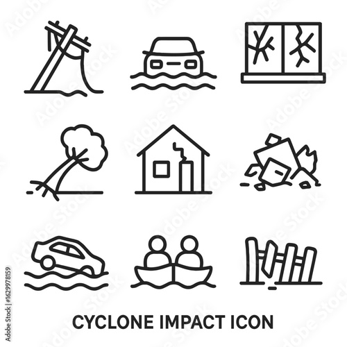 Snowstorm Aftermath outline icon set: quiet neighborhood, car tracks, snow pile, shovel blade, tree limb, overcast sky.