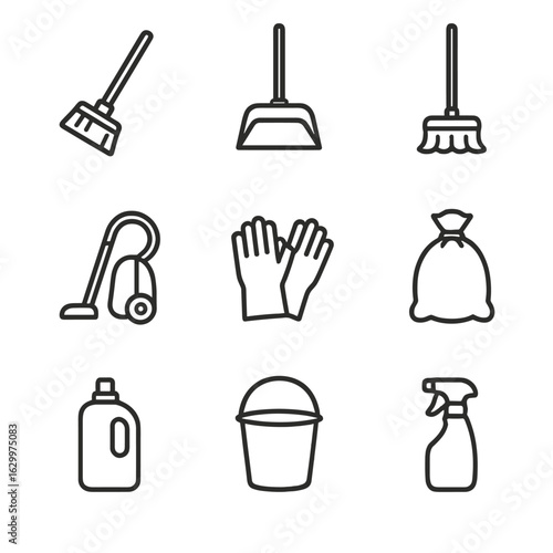 Outline icon set of horticultural care practices, including a watering can, pruning shears, fertilizer bag, mulch pile, trowels, potted plant, gardening gloves, and spray bottle, representing