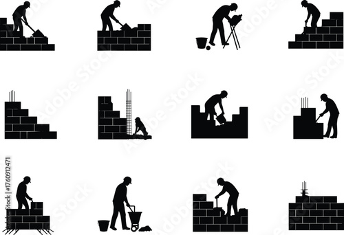 Masonry Tools Icons. Outline icon set of masonry materials and tools: trowel, mortar, bricks, block, concrete,