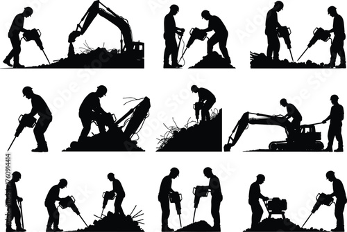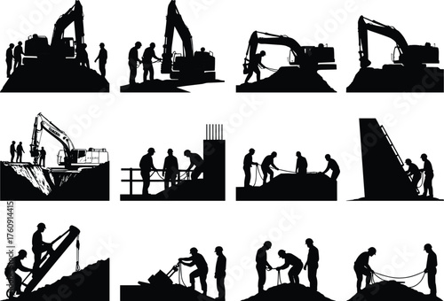 Construction worker silhouettes welding with sparks, holding tools, beams, and safety gear, black industrial welder vector illustration for metalwork, engineering