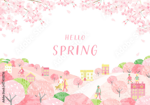 桜が咲く春の街並みと人々のベクターイラスト背景