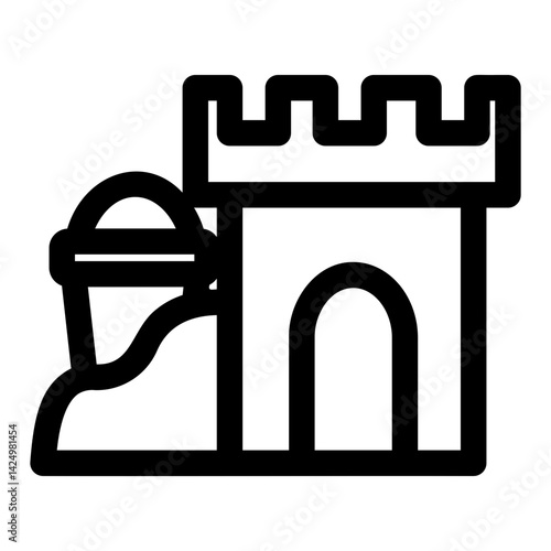 Fortress with towers built of sand on shore in monochrome. Beach toys. Simple minimalistic vector in black ink drawing on transparent background