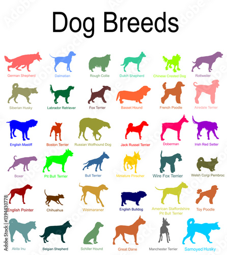 Silhouette illustration showing various dog breeds in different poses and orientations on a white background