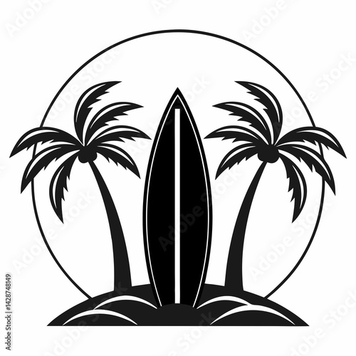 Black silhouette shows palm tree and surfboard on a tropical island landscape