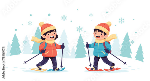 Two siblings giggling and chatting as they walk hand in hand through their neighborhood playfully kicking snow at each other as they go.. Vector illustration