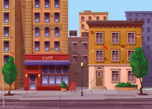 Scene of beautiful cityscape with hight building, shop and street with park, vector illustration