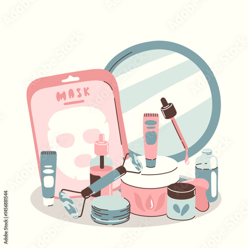 Face sheet mask. Illustration set with girl using mask, skin care, beauty routine. Cute vector illustration in flat style.