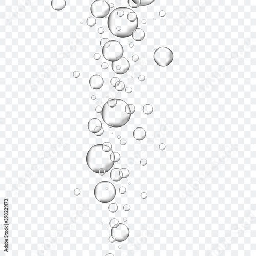 Air bubbles in water. Soda pop template. Champagne fizzy air effect. Sparkling water with oxygen bubbles. Realistic underwater fizz on transparent background. Vector illustration.