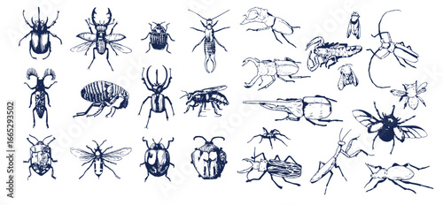 Hand-drawn insects collection featuring butterflies, beetles, bees, and more in vintage style
