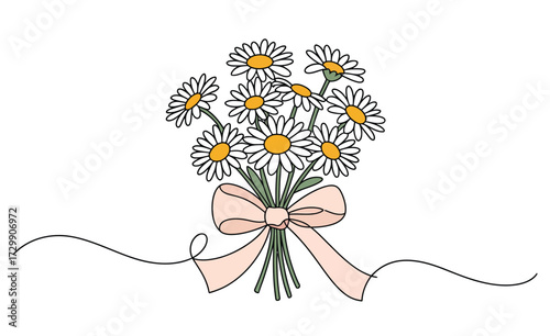 A charming hand drawn illustration of a bouquet of daisies tied with a soft pink bow presented on a clean white background with delicate trailing ribbons perfect for greeting cards and spring designs