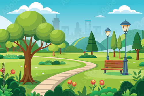 Stylized city park illustration featuring trees, grass, flowers, and a city skyline in shades of blue and green