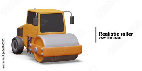 3D yellow and black road roller, view from different angles. Heavy construction equipment