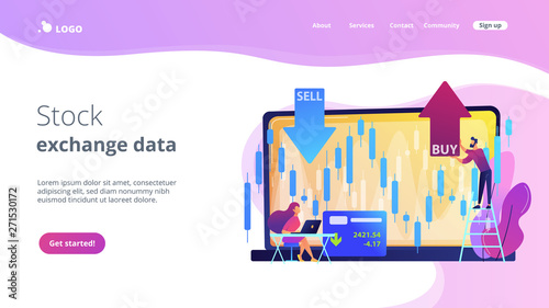 Tiny people stock traders at laptop with graph chart buy and sell shares. Stock market index, stockbroking company, stock exchange data concept. Website vibrant violet landing web page template.