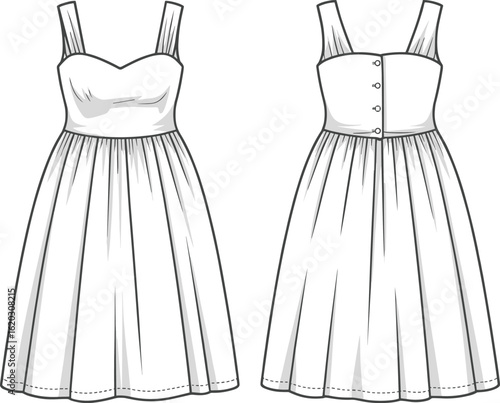 Fit-and-flare strappy dress front and back, cad drawing flat vector illustration, technical fashion sketch, structured bodice design, flared hem silhouette