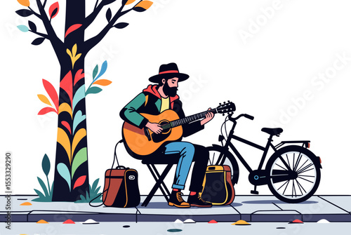 Street Musician Playing Guitar with Bicycle and Colorful Tree Illustration in Vector Style
