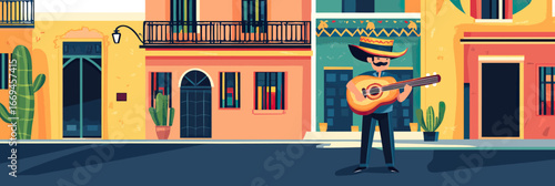 Mexican man playing guitar on colorful Mexico city street with traditional architecture, festive urban scene, cultural celebration background vector illustration
