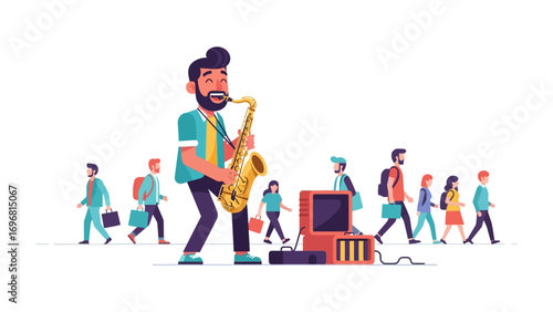 Melody Amidst the Crowd: A musician plays a saxophone, creating harmony as people navigate a city setting, captured in a charming flat illustration style.