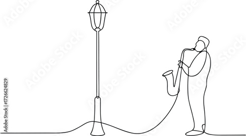 Man playing saxophone next to a lamppost one line drawing
