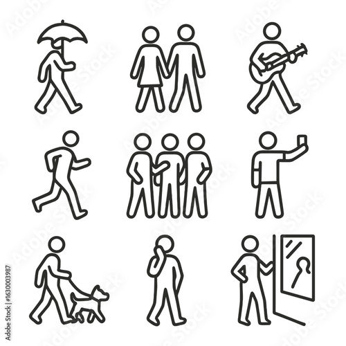 Pedestrian Activity Icons. Outline icon set of pedestrian activities: walking person with umbrella, couple hand in hand, street